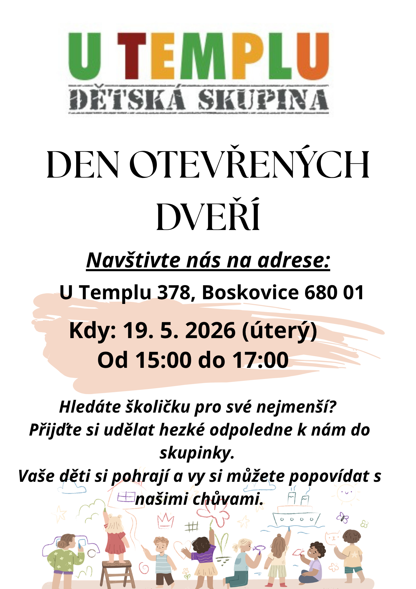 Srdečně vás zveme na Den otevřených dveří v dětské skupině U Templu, který se uskuteční v úterý 19.5. 2026 od 15:00 do 17:00 na adrese U Templu 378, Boskovice 680 01.